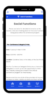 This includes social functions, prizes to be won, the exhibition floorplan, sponsor pitch schedule, delegate list, program, and speaker details.